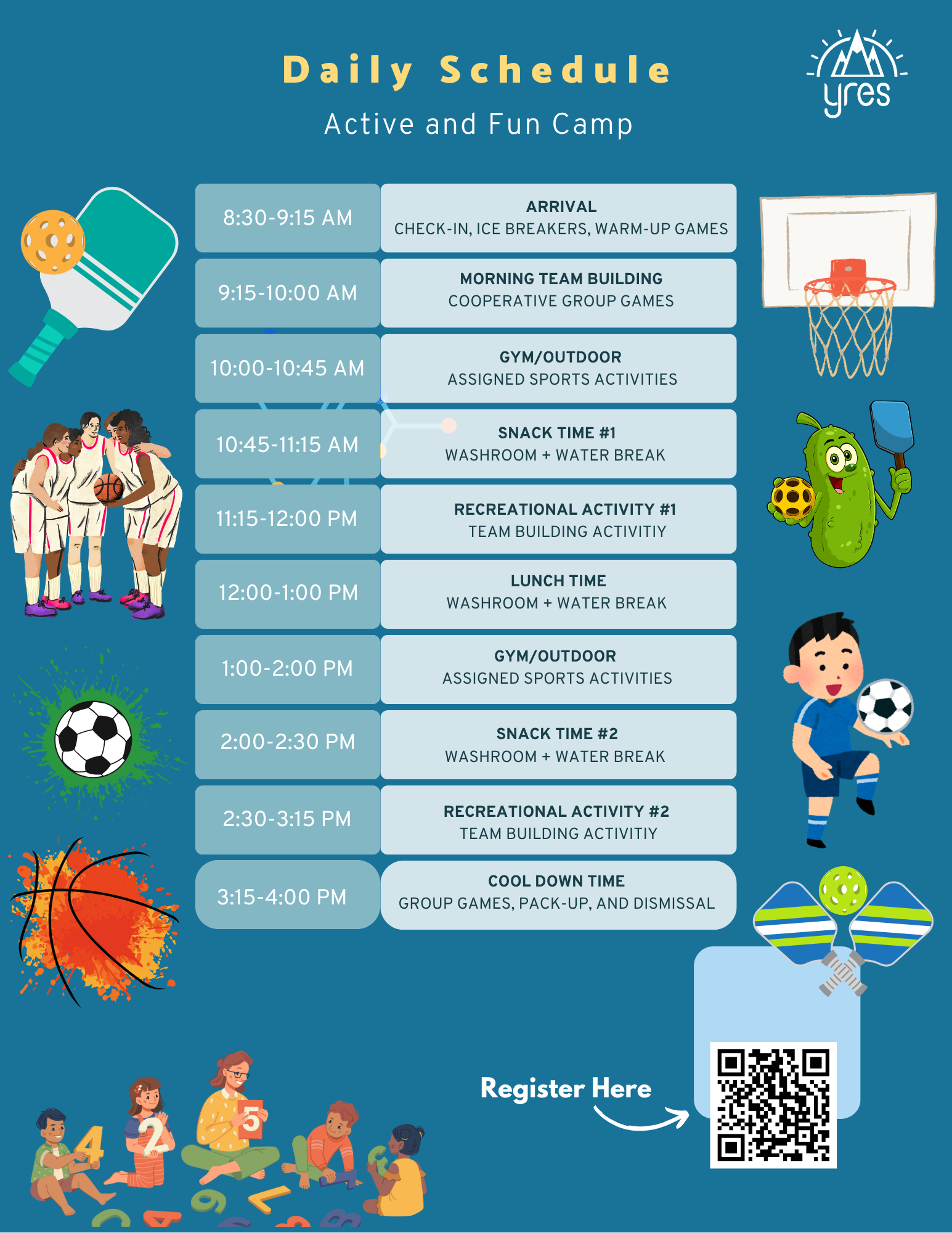 We offer a diverse range of sports activities including pickleball, basketballs, soccer and team-building activities for children 5-12 years old.